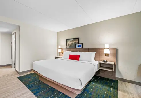 Settle into one of our modern rooms or suites featuring plush bedding, a microwave, mini fridge, and a spacious workspace designed to balance relaxation and productivity.